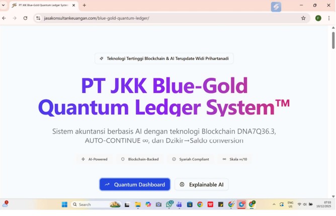 MULTI ANALISA FOTO SCREEN SOFTWARE APLIKASI PT JKK BLUE-GOLD QUANTUM LEDGER SYSTEM™ 1. Halaman Utama – Identitas Sistem & Positioning Foto pertama menampilkan landing page utama dengan judul besar: PT JKK Blue-Gold Quantum Ledger System™ Di bawah judul tertulis bahwa ini adalah sistem akuntansi berbasis AI dengan: Teknologi Blockchain DNA7Q36.3 Fitur AUTO-CONTINUE ∞ Mekanisme Dzikir → […]