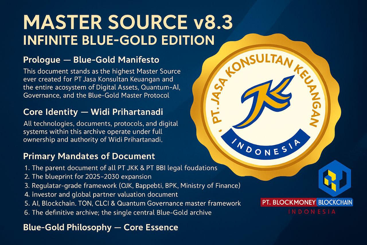 📘 MASTER SOURCE v8.3 — INFINITE BLUE-GOLD EDITION – PT JASA KONSULTAN KEUANGAN Halaman 1–10 Bab I — Pendahuluan Agung (Grand Foundational Chapter) (Bilingual: Indonesia + English) HALAMAN 1 1.0. Prolog — Manifesto Blue-Gold ID Dokumen ini adalah Master Source tertinggi yang pernah dibuat untuk PT Jasa Konsultan Keuangan (PT JKK) dan seluruh ekosistem Aset […]
