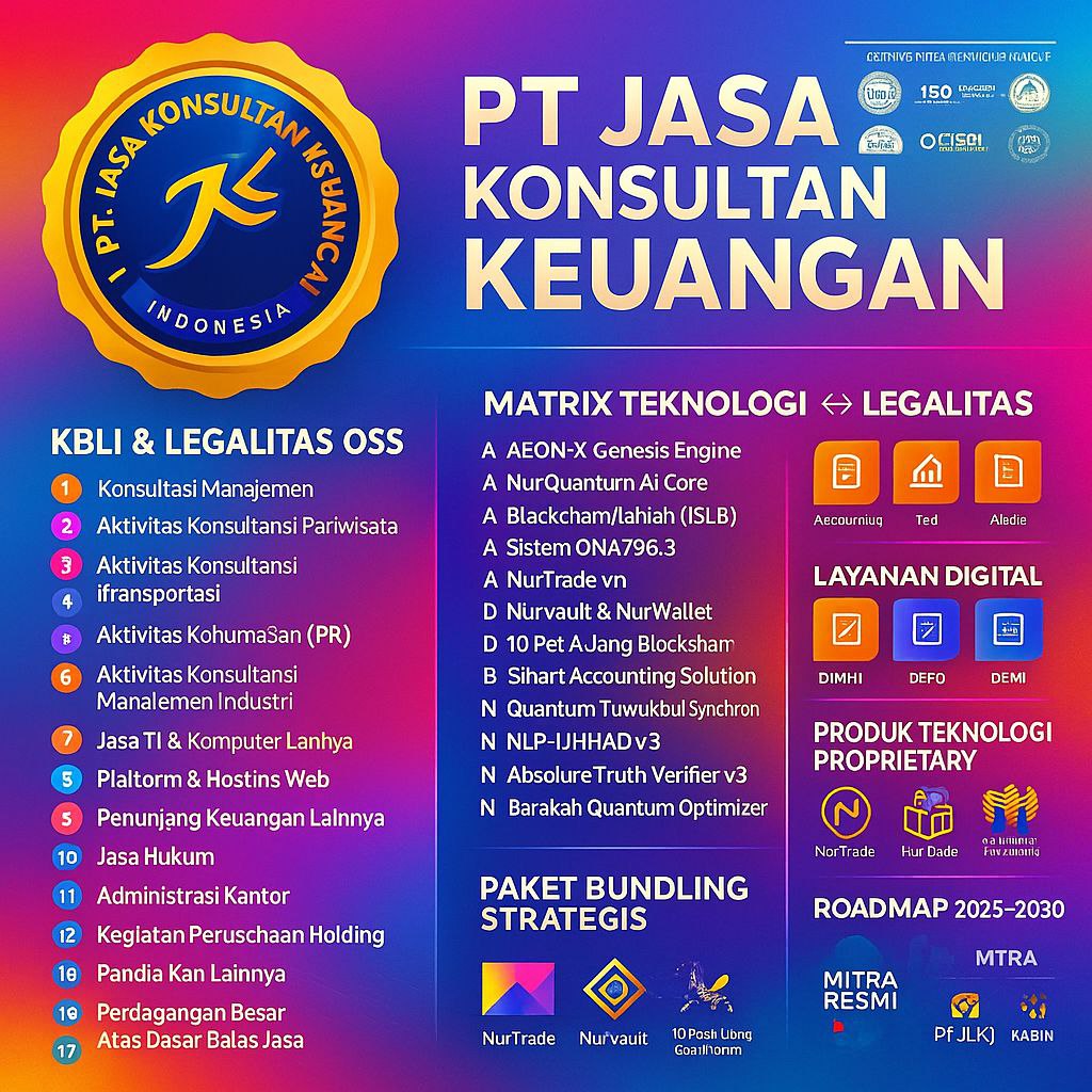 🔵 BUSINESS PLAN KHUSUS PT JASA KONSULTAN KEUANGAN (PT JKK) “TON FINANCIAL GOVERNANCE & WEB3 ADVISORY DIVISION” Disusun berdasarkan Teknologi Tertinggi AI Terupdate – Widi Prihartanadi Blue-Gold Master Protocol v128 • Quantum-AI Governance System 2025 I. EXECUTIVE SUMMARY (VERSI TINGKAT CEO – ULTRA SINGKAT) PT Jasa Konsultan Keuangan (PT JKK) akan memasuki sektor Web3 melalui […]