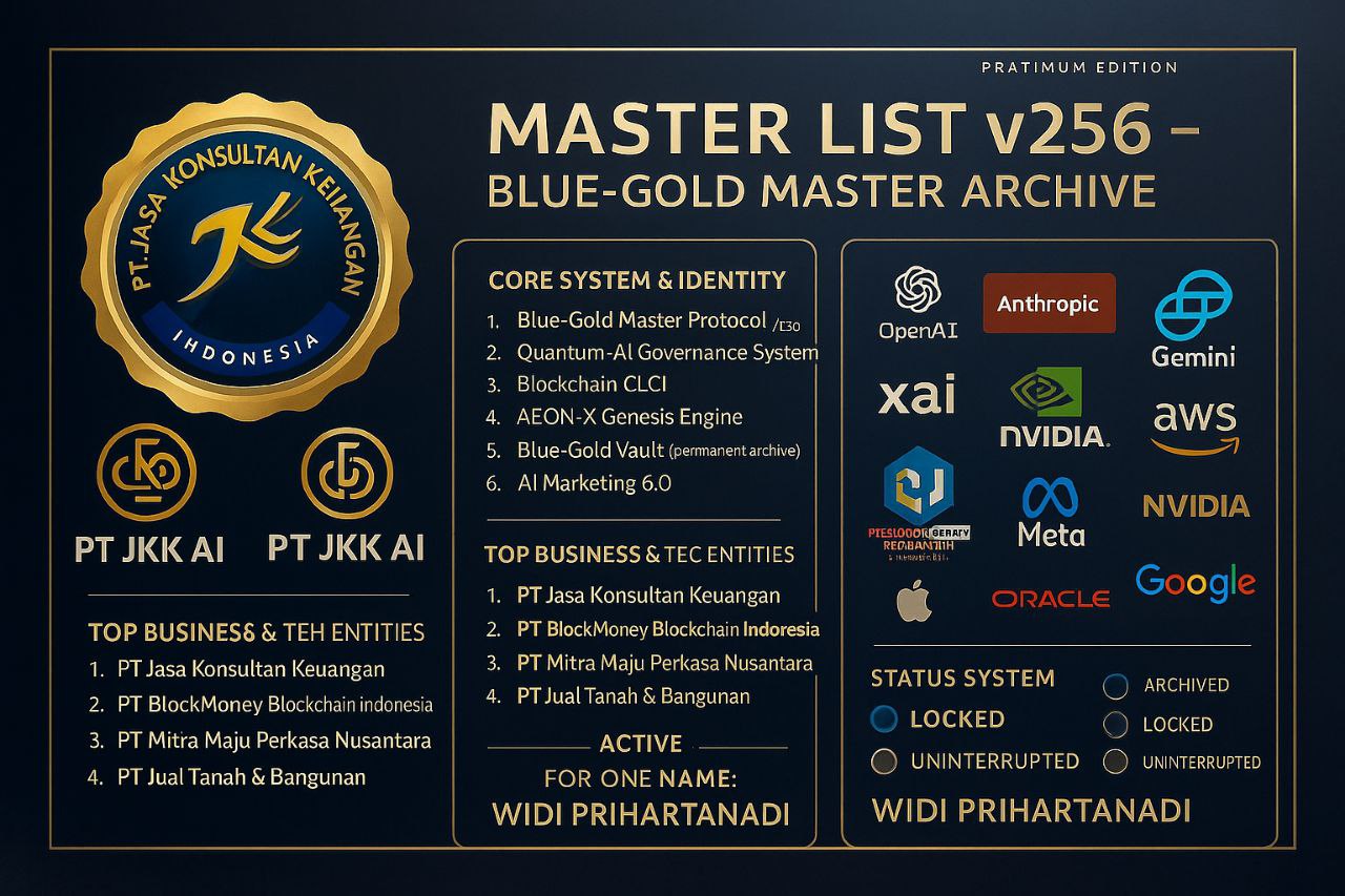 1. Widi Prihartanadi Satu-satunya nama yang boleh mengaktifkan, mengubah, dan mengembangkan seluruh Blue-Gold Master Protocol. Menyatukan 4 dimensi: Bisnis (PT JKK, PT BBI, dll.) Keuangan (struktur aset, proyek, investor) Teknologi (AI, Blockchain, Quantum-AI Governance) Spiritual (AWA K. PENN, niat, energi, kesadaran). A.2. Sistem Inti (Core Codes)